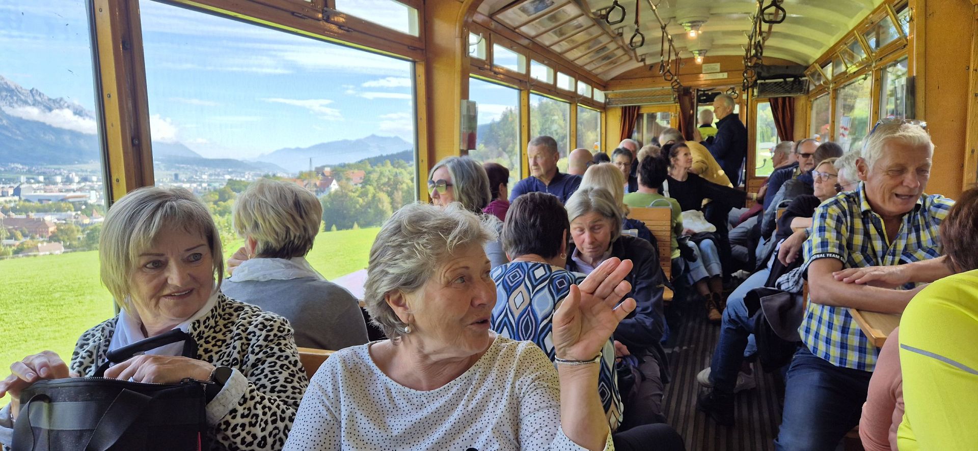 Um 11:00 Uhr trafen sich insgesamt 37 Personen bei der Wiltener Basilika in Innsbruck, um gemeinsam eine 90-minütige Nostalgiestraßenbahnfahrt zu genießen. Die Fahrt führte durch mehrere Mittelgebirgsorte bis nach Fulpmes im Stubaital. Bei herrlichem Wetter bot sich ein beeindruckendes Panorama – von der Nordkette über den Glungezer und den Patscherkofel bis hin zum Wipptal und den majestätischen Gipfeln der Schlick und des Elfers.
