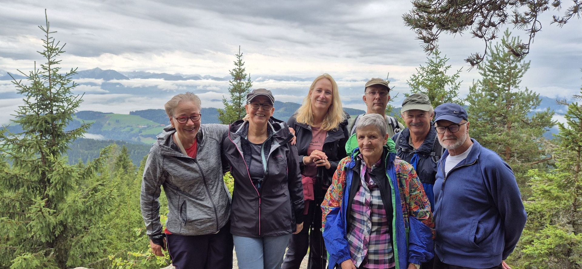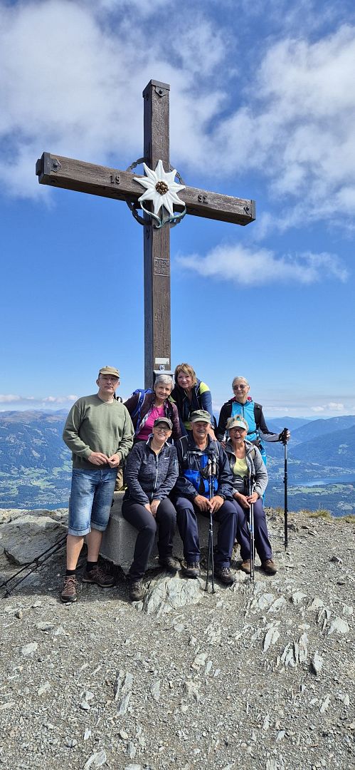 Gemeinsam erklommen Conny, Anton, Renate, Gerlinde, Uwe, Karin und Martina den Gipfel auf 2.142 Metern. Oben angekommen wurden wir mit einem überwältigenden Fernblick belohnt: Vom Großglockner über den Millstätter See bis hin zur Petzen reichte das Panorama – ein Moment, der uns alle tief beeindruckt hat.